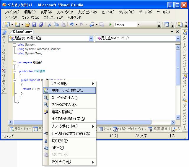 メソッドの上で右クリックをして、コンテキストメニューが出てきますので、その中の単体テストの作成を選択します。