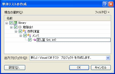 どのメソッド、どのクラスのテストを作成するかを選択します。